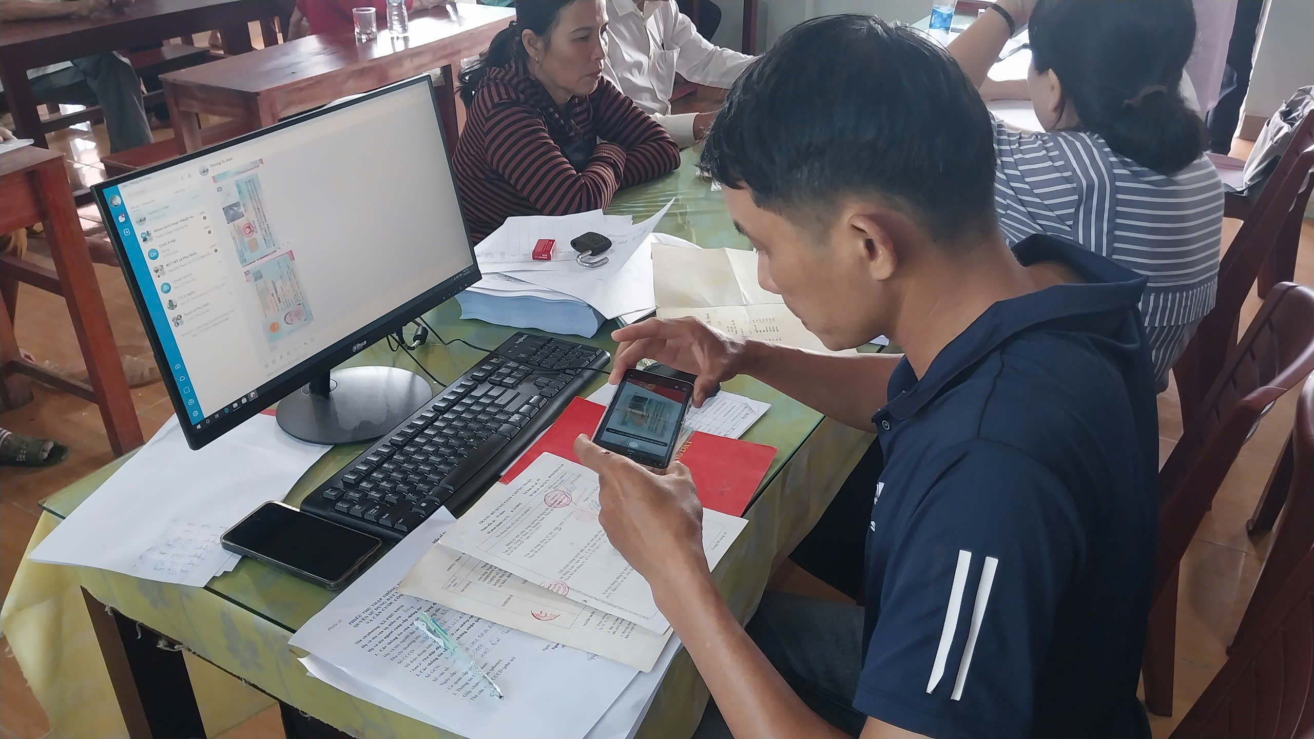 Các thành viên trong Tổ công tác đang hỗ trợ người dân thu thập thông tin dữ liệu đất đai