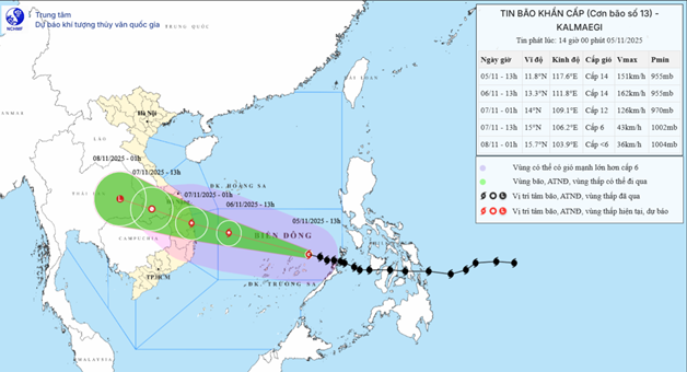 Hồi 13 giờ ngày 05/11, vị trí tâm bão ở vào khoảng 11,8 độ Vĩ Bắc; 117,6 độ
