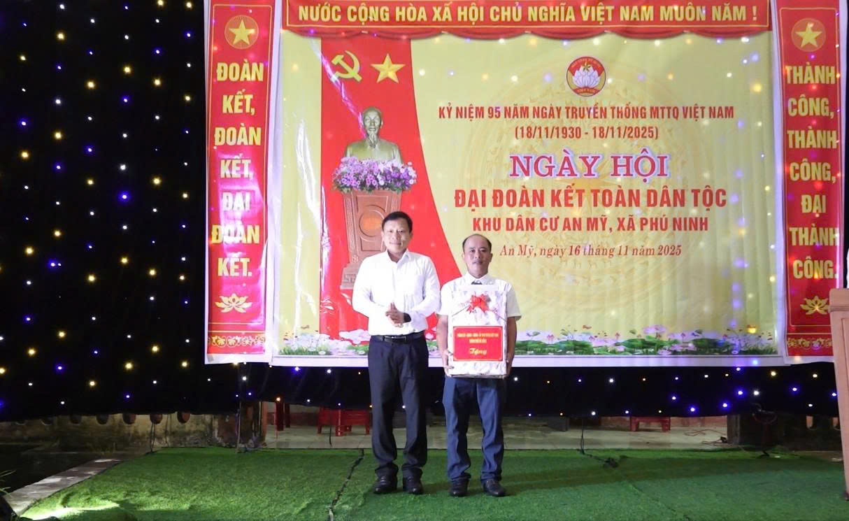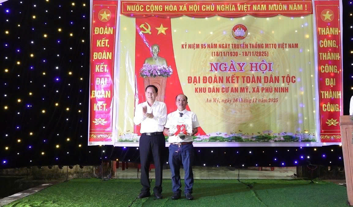 Ông Đặng Văn Đào, Bí thư Đảng ủy xã, Chủ tịch HĐND xã Phú Ninh trao quà chúc mừng khu dân cư An Mỹ nhân Ngày hội